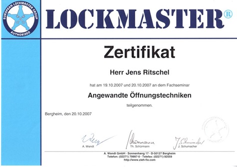 Seit mehr als 10 Jahren befassen wir uns mit dem Schlossnotdienst. Der Lehrgang 2007 bei der Firma Wendt war sehr hilfreich, um noch mehr zerstörungsfreie  Öffnungstechniken zu erlernen.